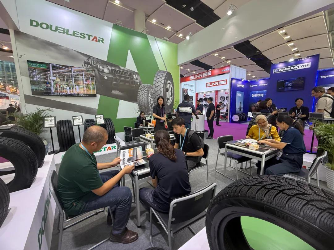 - 展会现场,双星轮胎的展厅现代而醒目,针对不同市场与应用场景打造的多款高差异化、高性价比产品受到众多客户的瞩目。 - 其中全钢明星产品DMS100,具有卓越的操控和驾驶性能,采用垂直花纹设计,超宽胎块和深槽为用户提供了稳定且高里程的驾驶体验。 - 半钢经典产品DH03具有卓越的抓地性能,优化滚阻有效降低油耗的同时在制动时保证了高安全性,独特的花纹设计有效降低胎噪,保证了驾驶的舒适性。
