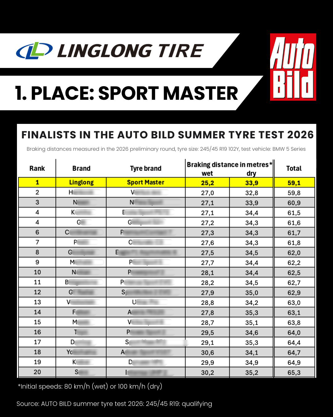 《Auto Bild》本次测试汇集了50款轮胎产品,仅刹车距离最短的20款轮胎能够晋级决赛。在这场严苛选拔中,玲珑Sport Master干地与湿地制动总成绩位列第一。尤为突出的是,其湿地制动成绩达到25.2米,比第二名短出近两米,展现出碾压级的湿地制动优势。这一“全能+单项”双料表现,让Sport Master在预选中毫无悬念地斩获榜首。