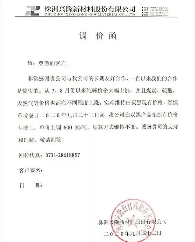 9月22日,株洲兴隆新材料股份有限公司发布涨价通知,由于纯碱等原材料价格上涨,自9月23日起,白炭黑产品价格上调600元/吨。
