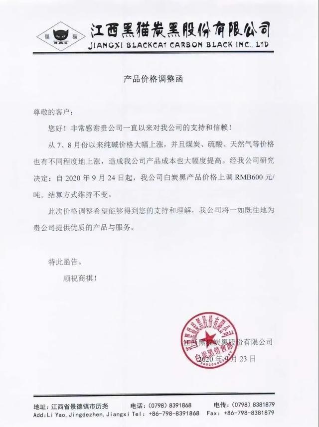 江西黑猫炭黑9月23日发布涨价公告,对白炭黑价格每吨上调600元。从7、8月份以来,纯碱价格大幅上涨,并且炭黑、硫酸、天然气价格也有不同程度上涨,造成公司产品成本大幅度提高。