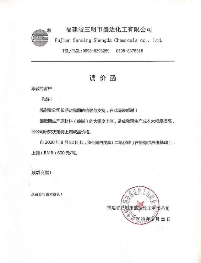 福建省三明市盛达化工宣布,由于纯碱等原材料价格上涨,自9月22日起白炭黑涨价600元/吨。