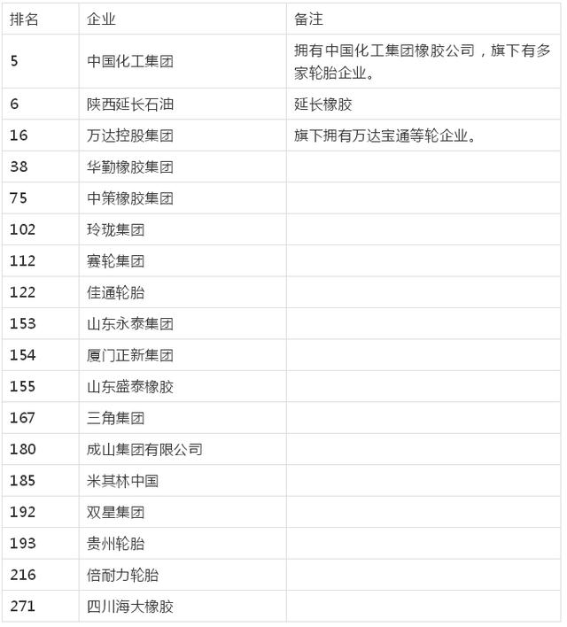 排名企业备注5中国化工集团拥有中国化工集团橡胶公司,旗下有多家轮胎企业。6陕西延长石油延长橡胶16万达控股集团旗下拥有万达宝通等轮企业。